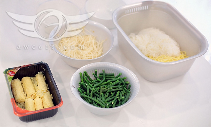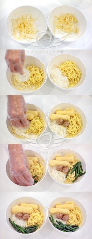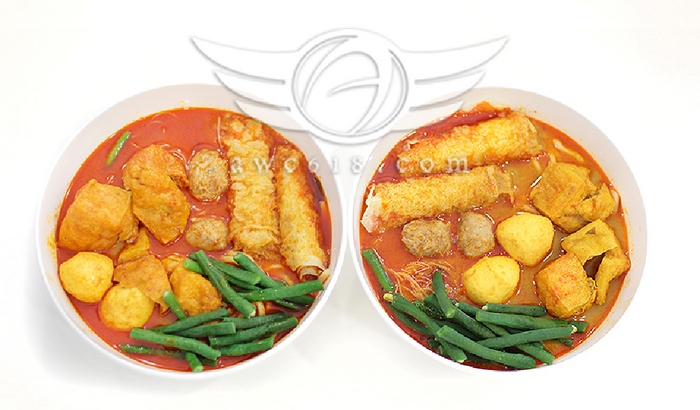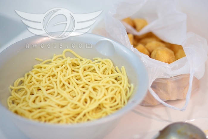 咖哩麵食材:油麵、米粉、響玲、豆卜、豆角、芽菜、素魚蛋