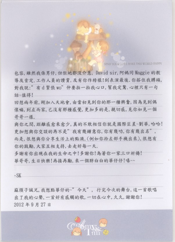 親愛的靚仔華:大叔!雖然肉麻的話只能在生日的時候説,不過因為太想你了,所以只好再上來肉麻一下,昨天夢見掉到大海,一沈一浮,然後大叔就像變型金剛一樣,不過你變成游泳圈救我!夢中好感謝,可是醒來可笑死我了,怎麼不是變成超人比較快!哈哈!你曾經有夢過我們嗎?我們是怎麼樣呢?小公主睡覺時會作夢嗎?聽說有的小朋友睡覺時會微笑呢!有這麼帥氣的爸比,作夢也會笑吧!今天很想說句麻麻的話,