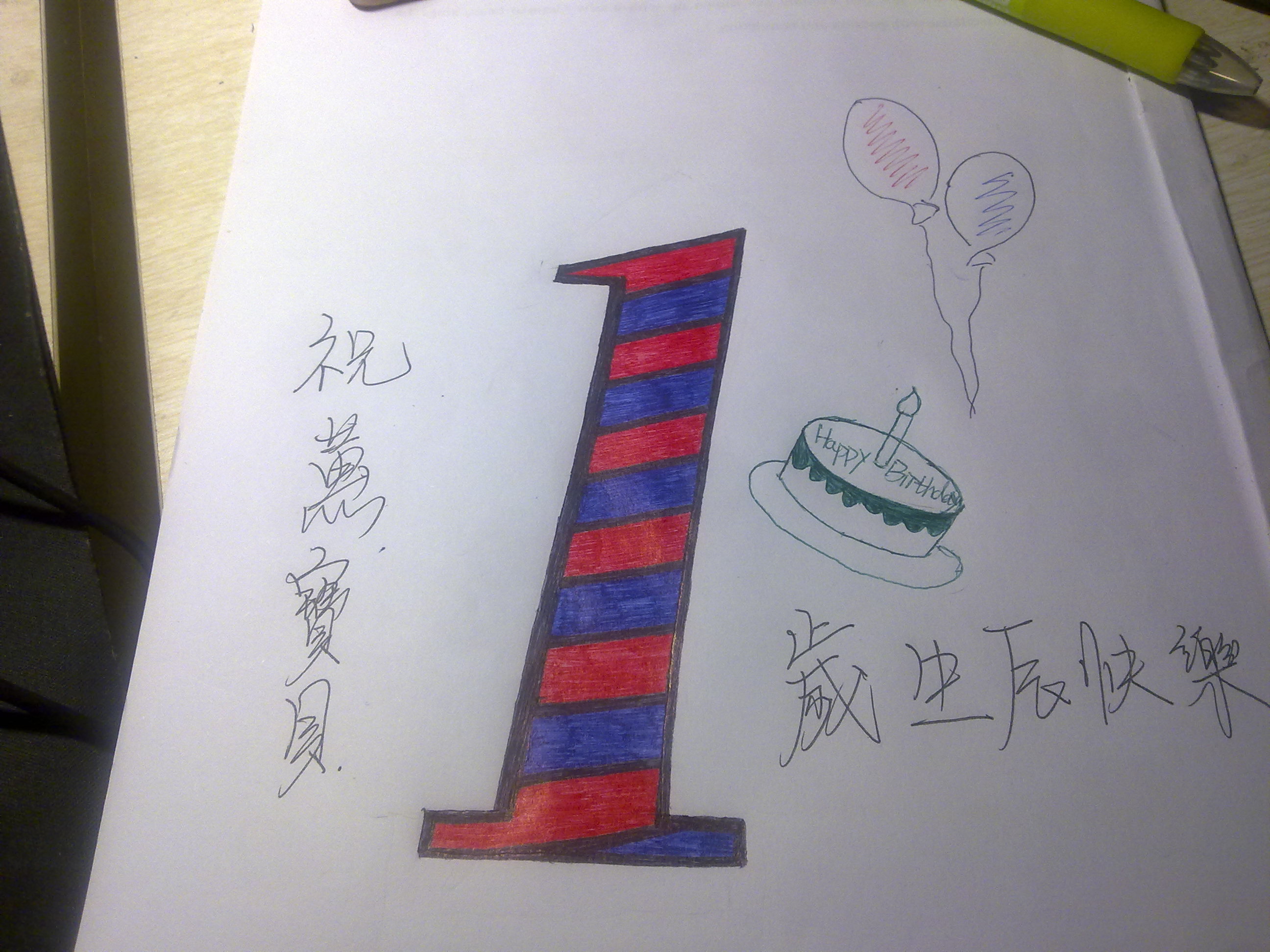 本來還想多畫點,可惜寢室沒有彩色筆,只有圓珠筆。在改完論文之後剛趕著畫了一張出來。簡簡單單的禮物,祝最最可愛的小公主蕙寶貝生辰快樂,茁壯成長,天天開心。ps~蛋糕好可愛啊,哈哈,老大有沒有偷吃啊~~~我要睡了哦,晚安。