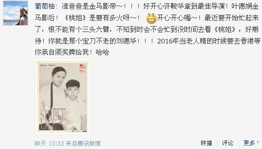 雖然在家裡道喜道晚了,其實我一直都有關注你的消息,只是現在課業太忙,不能像以前一樣有很多時間待在AWC的家中,很多你的留言看過後都沒有留言,但是愛你的心永遠不變!哈哈,我在微博中說要等2016年當老人精的時候去香港等你親自頒獎牌給我,這個就是我現在最大的心願!一如既往地愛你、撐你、支持你!祝老大和嫂嫂以及可愛滴小BABY永遠幸福~~~!:) 當然還有Andox和黑仔,哈哈,我們是相親相愛一家人!